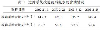 采用微孔陶瓷过滤器进行氨水除油,从2007年2月运行半年以来,取得了很好的效果,为后道工序创造了良好的条件,稳定了生化污水的进水水质,提高了污水处理效率。氨水表面看不到有明显的浮油。蒸氨塔底部排出的焦油量大幅度减少。蒸氨塔塔压降低,排油管道堵塞次数明显减少。经化验得知,氨水含油量大幅度降低,从以前的140mg/l降低到目前的60mg/l,表1为氨水过滤系统改造前后氨水含油量的对比情况。